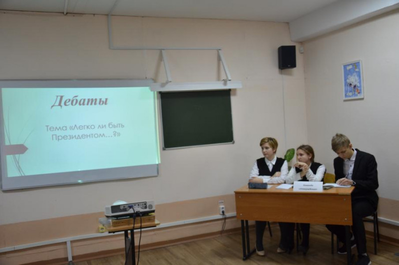 Ученики 10 классов стали участниками дебатного турнира, тема которого «Легко ли быть президентом?». Ребята отстаивали разные точки зрения, но все-таки сошлись во мнении, что быть Президентом страны – это очень ответственная, требующая от человека самоотдачи и самопожертвования должность.