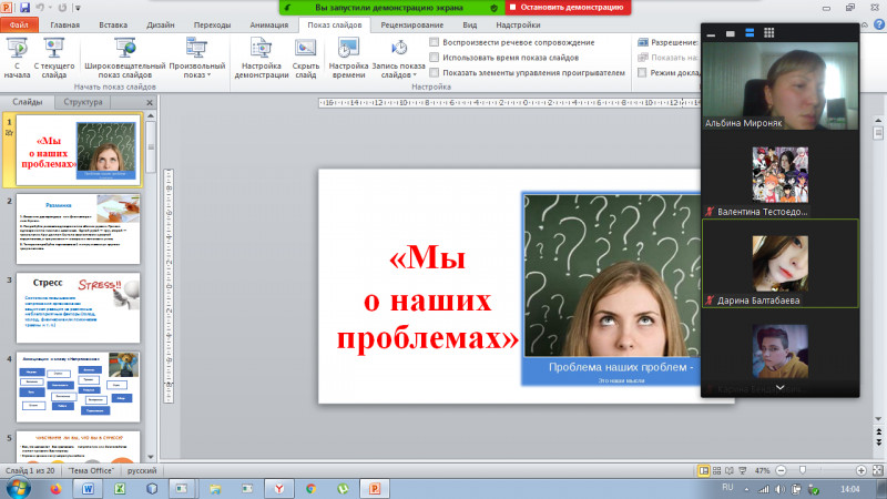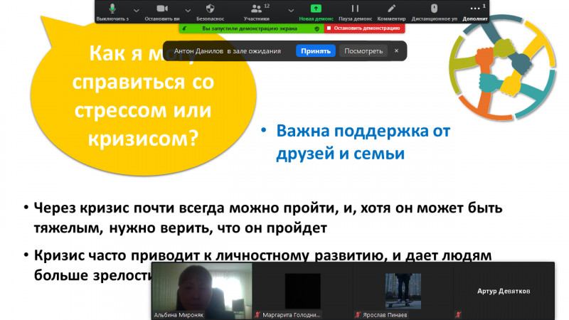 16 и 17 ноября 2020 года педагогом-психологом КГУ СШ №9 Мироняк А.А. проведён информационный час-беседа «Мы о наших проблемах» для учащихся 10 классов. Цель данного мероприятия: обсуждение актуальных проблем учащихся. В ходе беседы были обсуждены возникающие трудности учеников, способы реагирования и способы саморегуляции. Во время классного часа ребятами были отработаны несколько практических техник-упражнений.