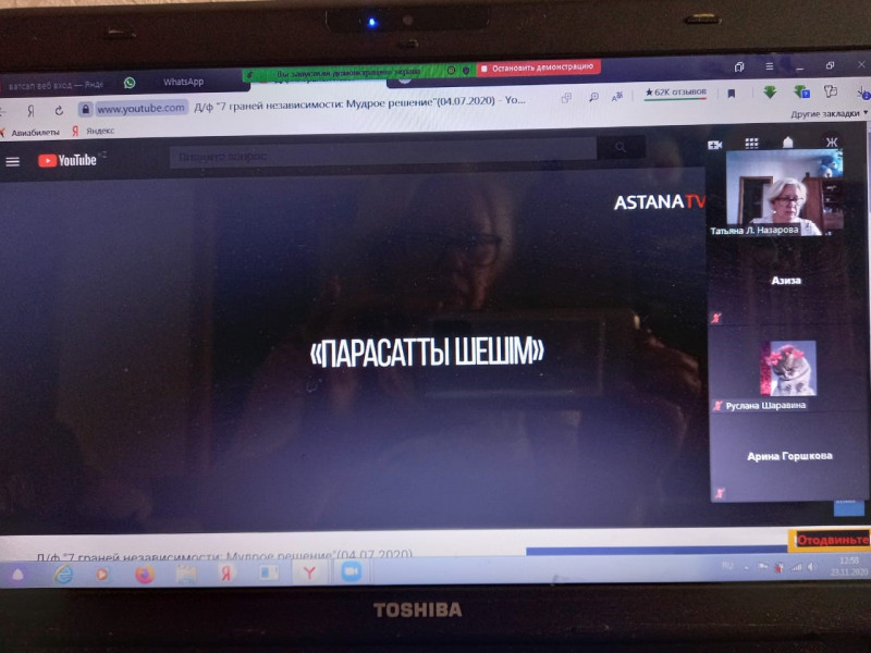 23 ноября 2020 года в КГУ «Средняя школа № 9» в рамках плана мероприятий по продвижению ценностей Независимости Республики Казахстан, в преддверии празднования Дня Первого Президента и Независимости Республики Казахстан, в режиме ДО на параллелях 8-11классов, классными руководителями проведены конференции на тему «Роль Первого Президента - Елбасы в превращении Казахстана в безъядерную державу», по документальному фильму «Мудрое решение» из цикла «Семь граней независимости».
