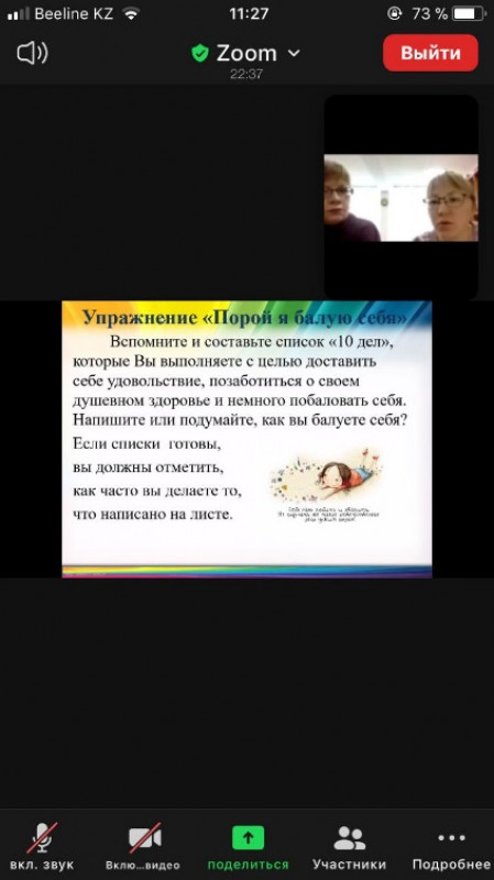 19 января 2021 года педагоги -психологи КГУ «СШ № 9» Попова Татьяна Владимировна и Мироняк Альбина Азатовна провели для школьных психологов города Мастер -класс на тему «Обеспечение психологического здоровья педагогов и учащихся как необходимый компонент их здоровьесбережения».