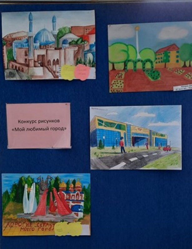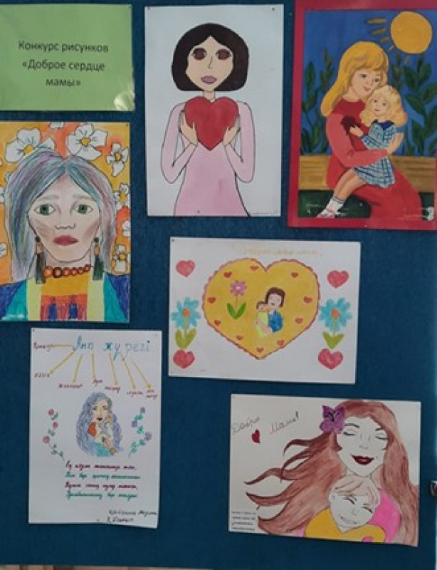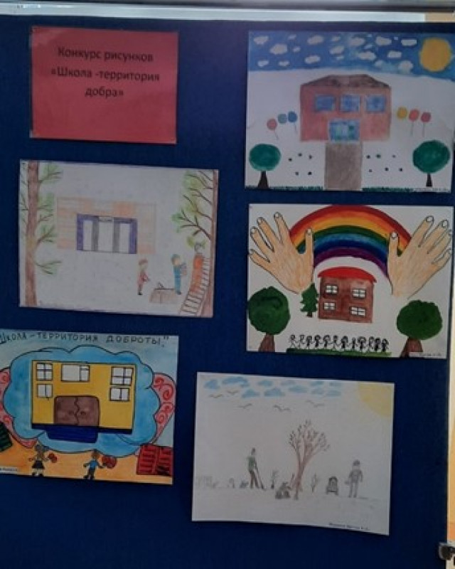 В фойе школы размещена выставка рисунков на темы: «Школа – территория добра», «Мой любимы город» и «Доброе сердце мамы».