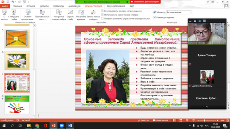 10 февраля 2021 года на платформе ZOOM для учащихся 6-х классов был проведен урок «Любовь – основа жизни», на котором речь шла о деятельности Сары Алпысовны Назарбаевой, авторе программы «Самопознание».  Эта программа позволяет детям с раннего возраста осваивать науку — быть хорошим человеком. Далее была проведена викторина «Мир Самопознания», на которой ребята смогли обобщить и систематизировать свои знания по предмету. В конце викторины были названы победители, которые показали наибольшие баллы за правильные ответы.